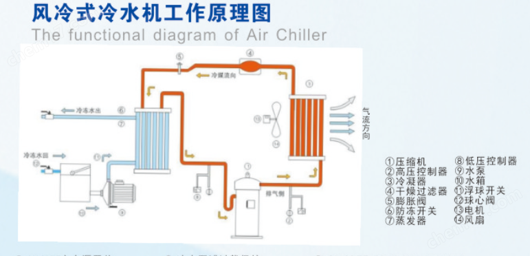 风冷式冷水机具有独立的制冷系统,会受气温及环境的影响,在它机身内含有保温水箱和水泵,无需再另加冷却水塔来散热,安装和移动非常方便.